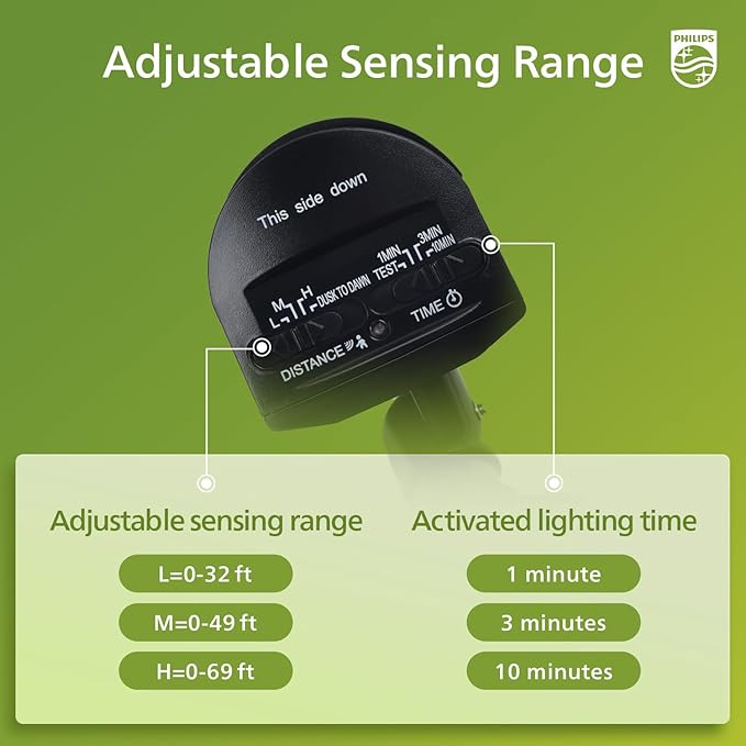 - HIGH-SENSITIVITY MOTION SENSOR - High-sensitivity passive infrared (PIR) motion sensor detects motion up to 69 ft away over a 180° angle; you can set light on time for 1, 3, or 10 mins.
