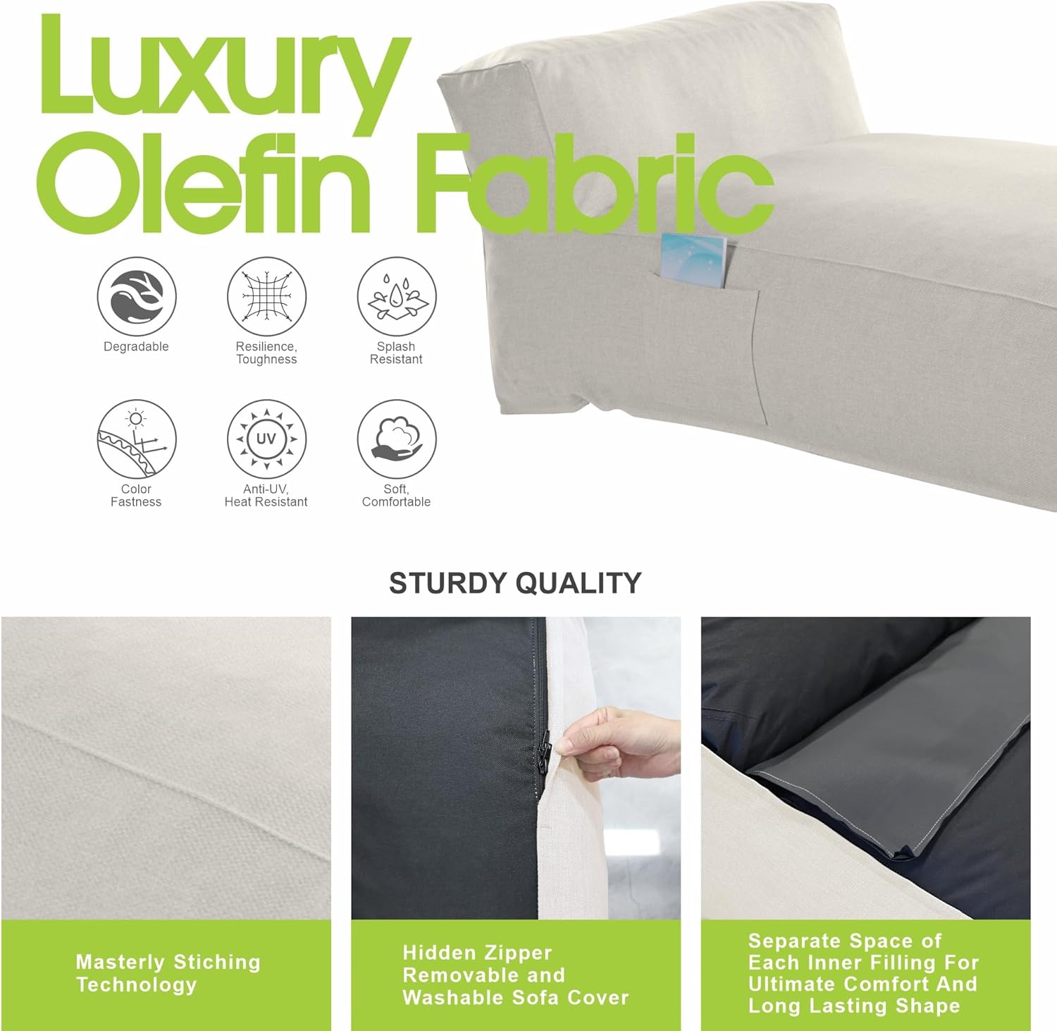 - Premium Olefin Fabric – Water Repellent, UV Resistant, and Durable - Made with high-performance olefin fabric, this lounger resists splashes, fading, and UV rays while remaining breathable and soft. Olefin is known for its color fastness, heat resistance, and eco-friendliness, making it the ideal material for outdoor lounge furniture that looks good and holds up season after season.
