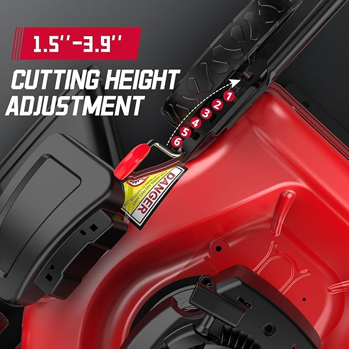 - Customizable Cutting Height with 6-Position Adjustment: Tailor your lawn's look with 6-position height adjustment, ranging from 1.5 to 3.9 inches. Achieve the perfect cut and finish for your lawn, whether you prefer a short, neat look or a lush, full appearance.