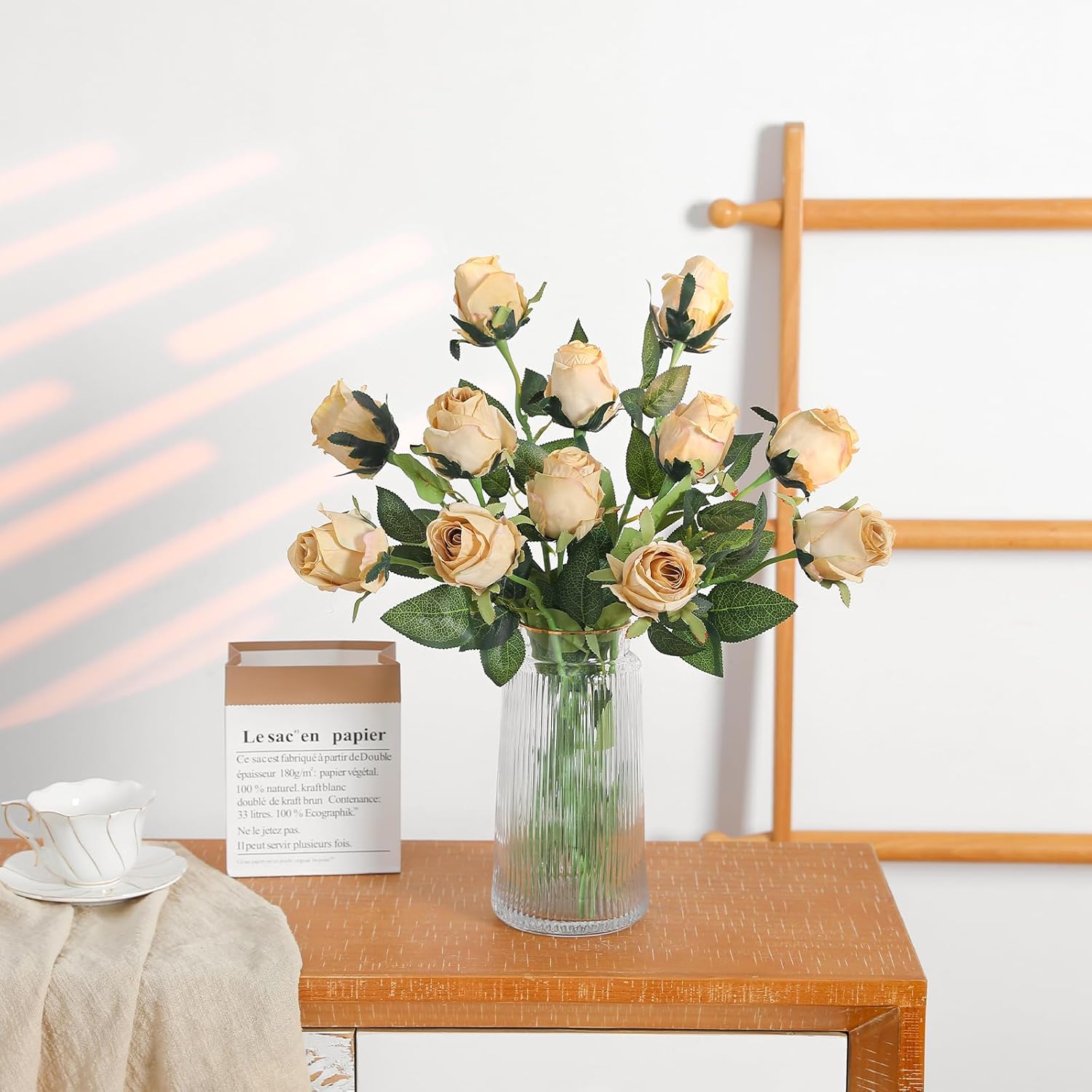 12Pcs Realistic Fake Champagne Roses Faux Flowers with Long Stems, Artificial Silk Rose Flowers for Valentines Day Home Wedding Decor Bridal Bouquet