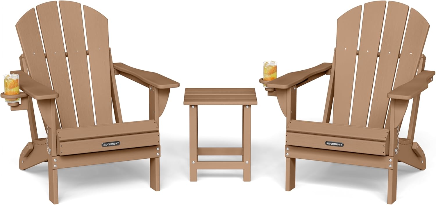 MUCHENGHY Folding Adirondack Chairs and Table Set, Outdoor Chair, Adirondack Chair Plastic, Fire Pit Chair, Weather Resistant with Cup Holder for Deck, Backyard, Garden(Teak, 3-Piece)