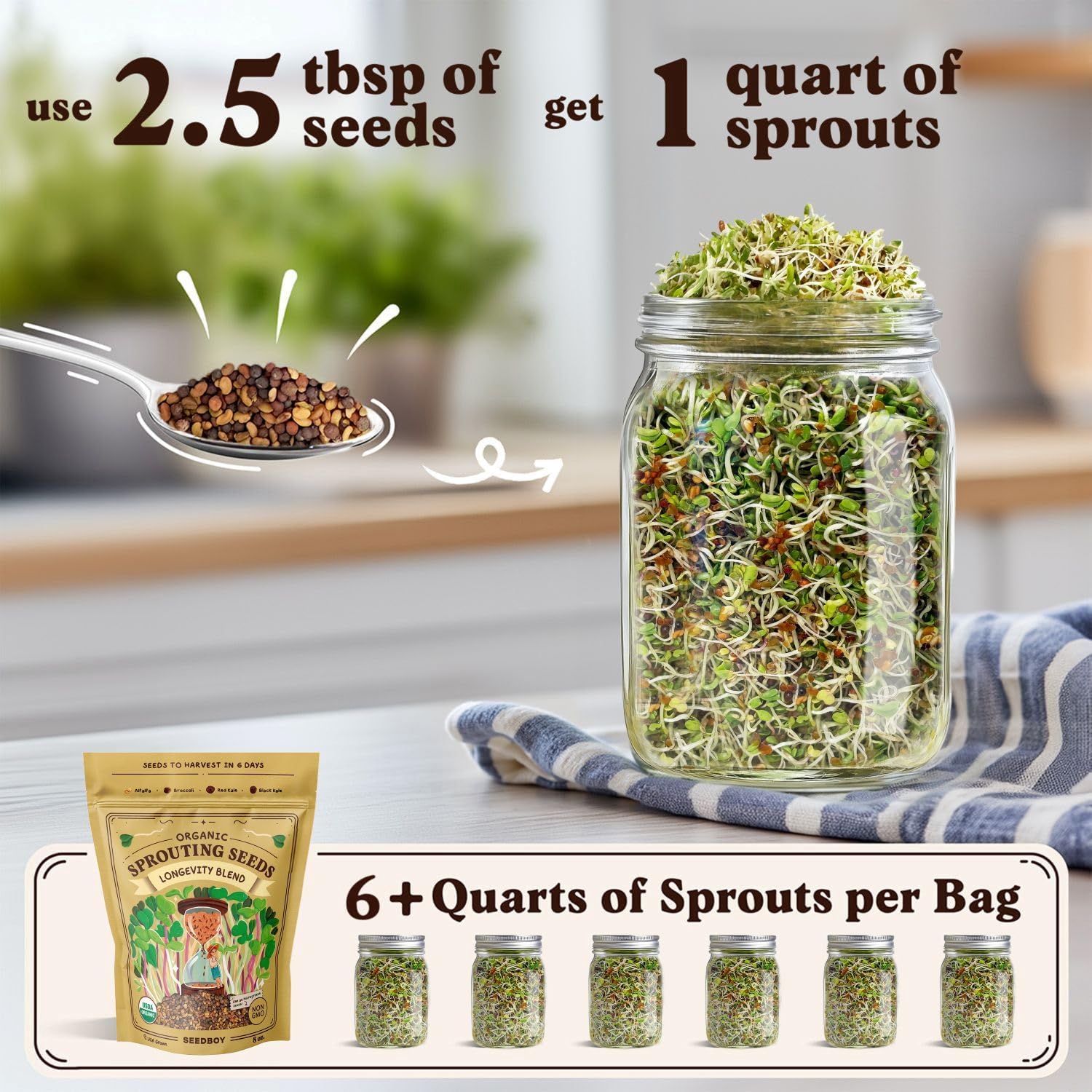 Seedboy Organic Sprouting Seeds - Longevity Blend- Non-GMO, USA Grown Microgreens Mix - Broccoli, Red Kale, Black Kale, Alfalfa - Makes Over 6 Quarts of Sprouts, 20 Servings (8 oz) (Longevity Blend)