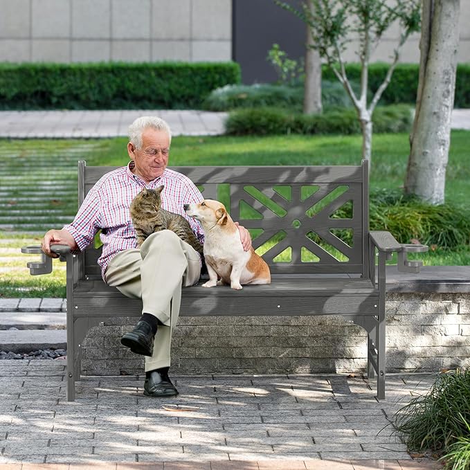 nalone Outdoor Bench with Cup Holders, HDPE All Weather Porch Bench Load up to 800 Lbs, 2-Person Garden Benches Rot-Proof Fade Proof for Patio, Porch, and Park (Grey)