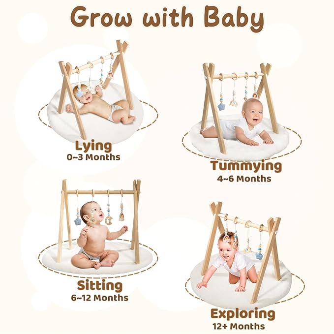 - 【Solid Wood Construction】Crafted from natural hardwood with a smooth, non-toxic finish, this baby gym offers exceptional durability and safety. The rigid frame is designed to withstand active use while providing a stable and secure play environment for infants during tummy time and exploration.
