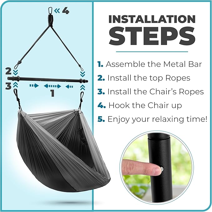 - Easy Installation: Set up your hammock camping chair hammock in minutes: simply assemble the metal bar, install the support ropes, hook up your chair, and relax! Instructions included.