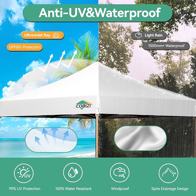 - [Upgrade Heavy Duty Canopy] The COBIZI 10x10 Heavy Duty Canopy features a commercial-grade full truss structure constructed from durable powder-coated stainless steel. The thickness of the 1.77 inch (45mm) hexagonal legs has been increased to 0.7mm/0.03 inches, providing superior stability and durability. Full truss design ensures exceptional sturdiness and rust resistance, capable of withstanding wind speeds of up to 30mph when properly secured with an number of ropes, and stakes.