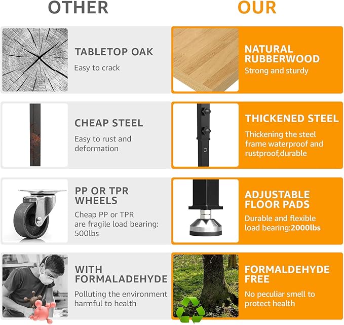 - Stable Construction:The frame of the work table is made of cold-rolled steel plates, which are very sturdy. Several thick crossbars keep the table stable when loaded.Meanwhile, the adjustable workbench is equipped with 4 rubber feet,effectively stopping it from sliding and protecting your floor. Moreover, all accessories, required tools, and detailed installation instructions are included, making it easy to assemble the heavy-duty workbench.