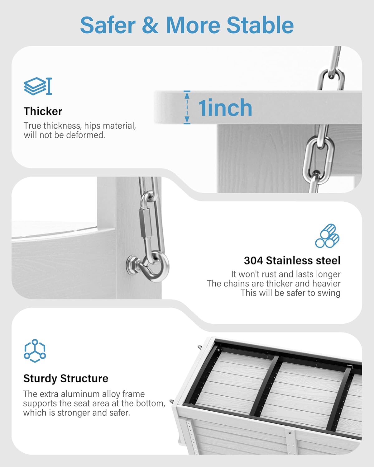 - Material: HIPS material can be resistant to wind and rain. YEFU porch swing does not need to be painted and maintained every year. It can be cleaned with soapy water.The hardware is made of 304 stainless steel, which will not rust. The surface is treated with wood grain to look like real wood.