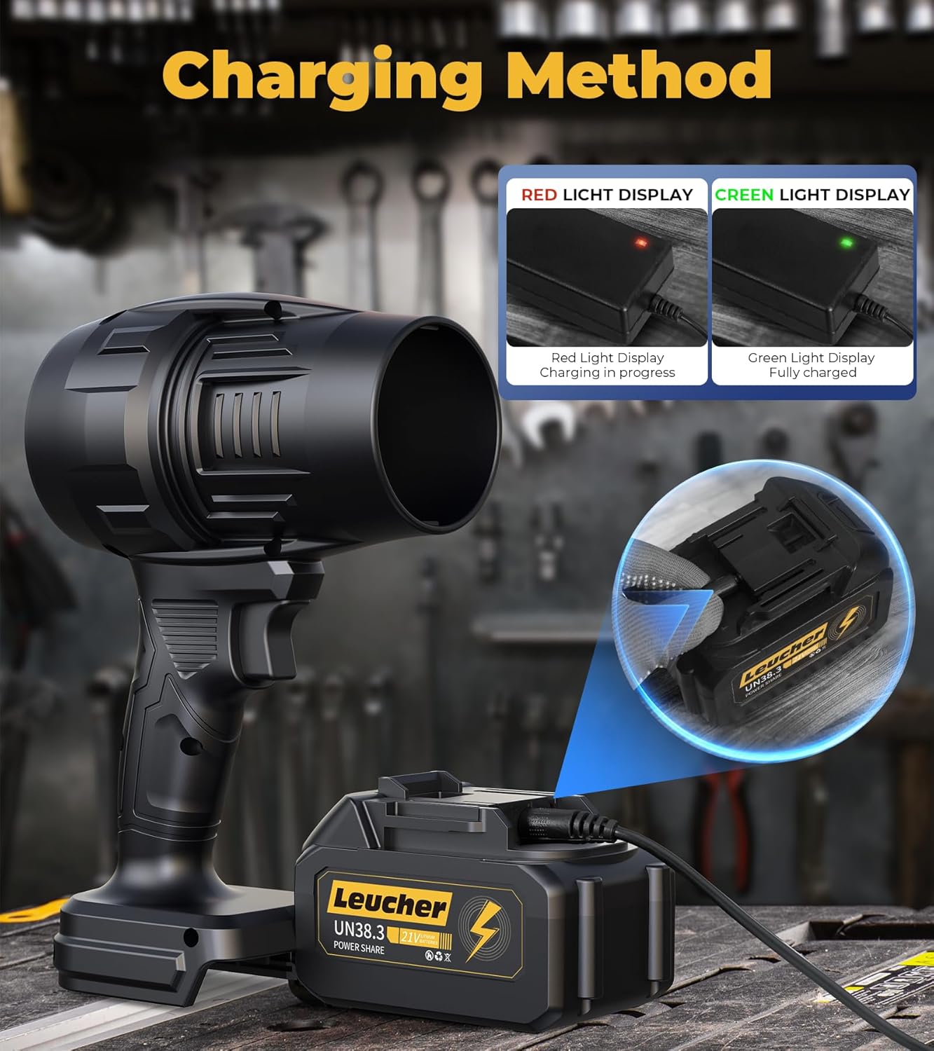 - 【Dual Batteries & Long-Lasting Runtime】Equipped with two 21V-3000mAh lithium batteries, this handheld leaf blower provides 50 minutes of continuous runtime (25 minutes per battery), ideal for large-scale tasks like clearing leaves, snow, or debris from gardens, driveways, or workshops. The rapid charger fully replenishes batteries in about 3 hours, with a clear LED indicator that shifts from red to green when fully charged. For extended battery life, store batteries fully charged when not in use