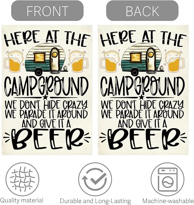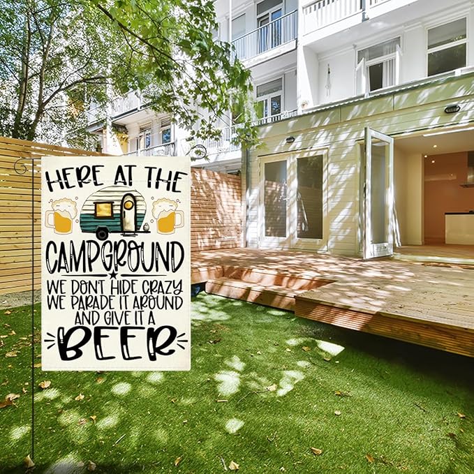 Welcome summer Garden Flag Here At The Campground We Don'T Hide Crazy We Parade It Around And Give It A Beer Small Double Sided Burlap art Stained Glass Style Garden Flags 12 x 18 Inch for Outside