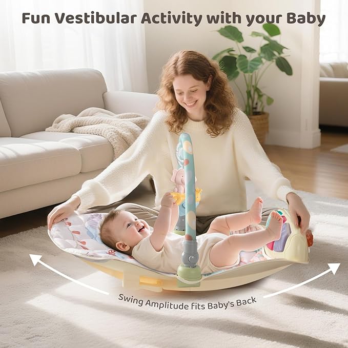 - All-in-One Baby Activity Center: This multi-functional lying training baby play gym , featuring a stable frame, breathable mat, four hanging sensory toys, and detachable musical piano toy.The eggshell-shaped support surface, which conforms to ergonomic principles, protects the baby's back. It operates silently and rhythmically, and can quickly soothe a restless baby