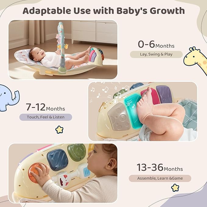 - Baby Multi-Stage Developmental Play Gym: From the initial sensory stimulation to active kicking and full-body movement training, this music game box with detachable hanging toys and multiple functional designs can be suitable for all stages of a baby's growth, each stage developing new pleasures