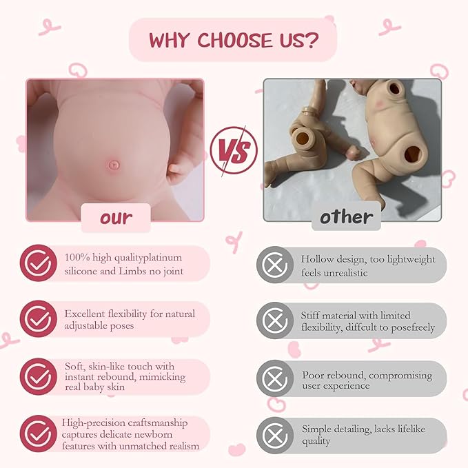 • Full Silicone Baby Doll – Unlike ordinary hollow vinyl dolls, our reborn baby doll is crafted from premium platinum silicone in one piece. She is soft, flexible, and weighs about 5.5 lbs, with a total length of 17 inch, making her very close to a real newborn’s size. Whether you cradle her, gently rock her, or pose her for photos, she delivers an incredibly realistic baby experience—just like having a sweet little one of your own.