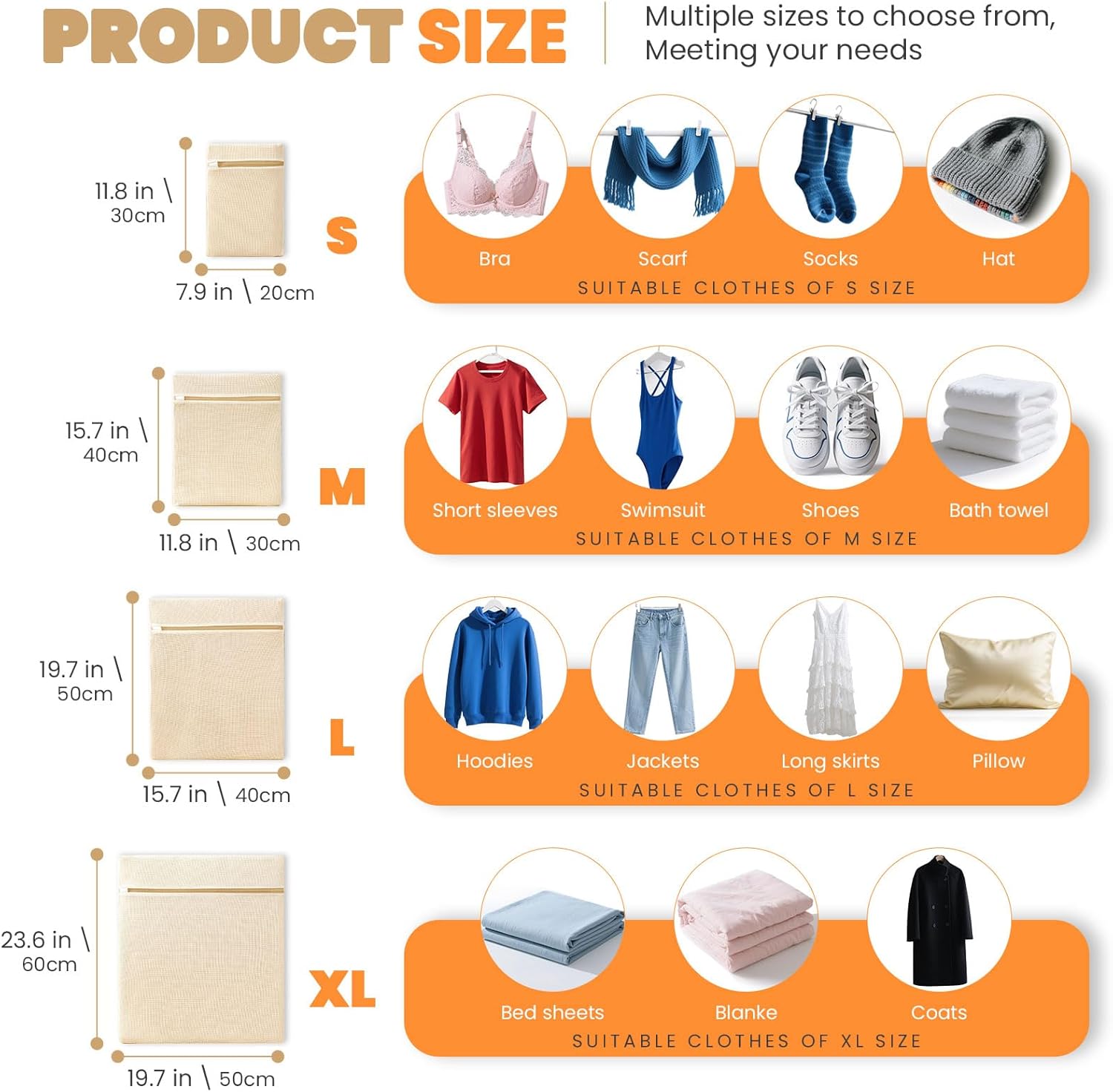 - 4-Piece Set Wash Bags with Multi-Size Options:This premium set includes small (11.8"x7.9"), medium (15.7"x11.8"), large (19.7"x15.7"),and x-large (23.6"x19.7") bags.he sizing accommodates everything from bedding to baby clothes.The graduated sizing system simplifies laundry sorting while the transparent mesh allows easy identification.Reinforced seams ensure durability through hundreds of washes