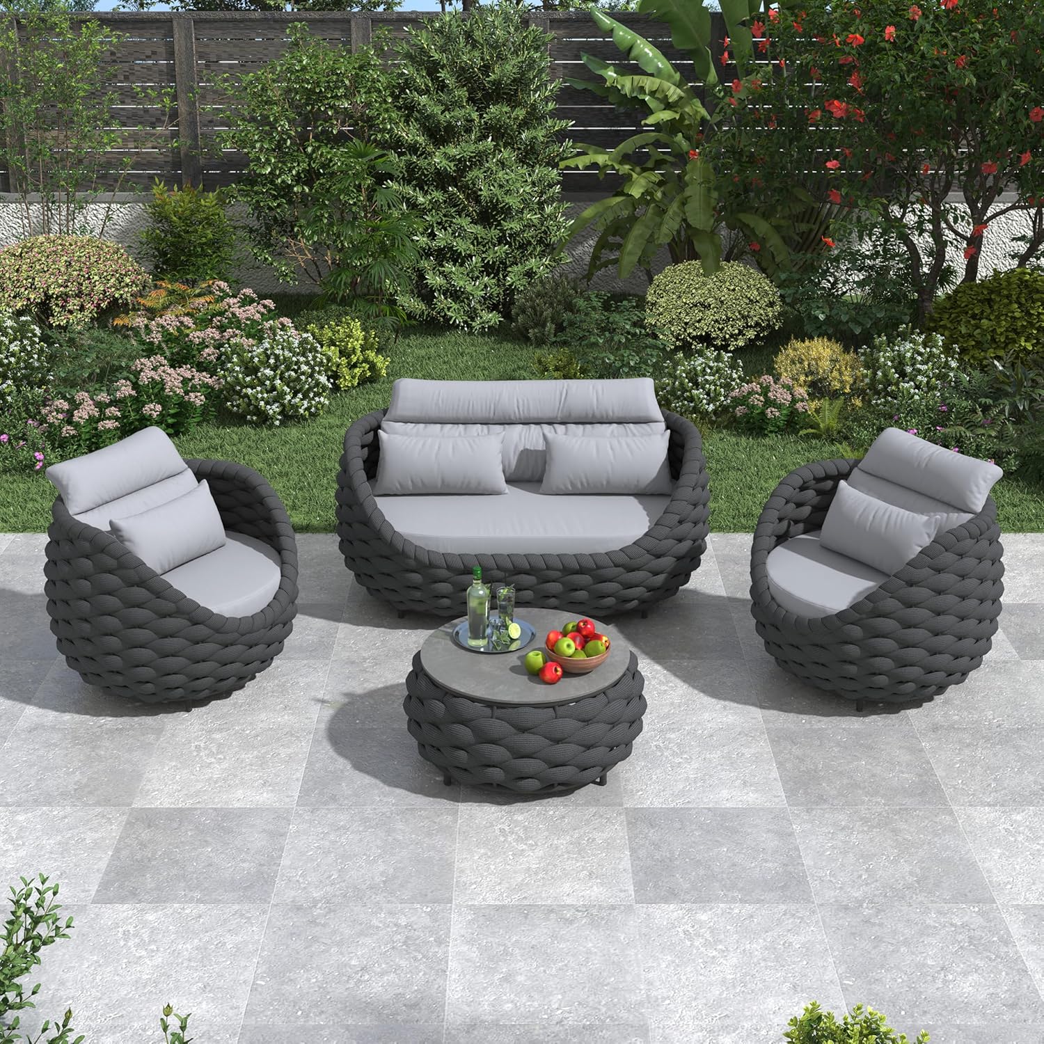 - Woven rope furniture set includes: 2 armchairs, 1 loveseat, 1 coffee table. Size: Single chair: 34.3''(L)X34.3''(W)X27.6''(H) holds up to 400 lbs/181.5kg; Loveseat: 55.1''(L)X34.7''(W)X27.6''(H) holds up to 661lbs/300kg; Side table: 28.4''(L)X28.4''(W)X14.2''(H) holds up to 176 lbs/80kg. Color: Dark gray rope and gray cushions