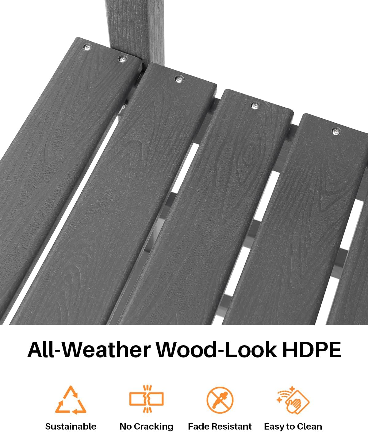 - Resilient HDPE in Wood Grain Finish: The smoke gray HDPE lumber replicates real wood’s texture without the downsides. It resists cracking, warping, and fading in full sun or stormy weather. Slatted seats dry quickly, keeping your outdoor area tidy and ready after rain.