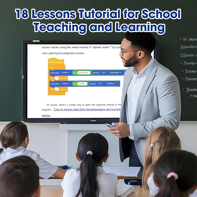 - ENTRY-LEVEL CODING KIT FOR BEGINNERS - Detailed online tutorial includes guidance, two different sample code - Scratch and Arduino, and 18 class of project-based learning. Designed for learning electronics and programming in a simple and fun way. The kit contains 12 projects to learn about the basics of different modules like buttons, LEDs, sensors, etc., and understand the application of IoT and sensing technology in home, cultivate technological innovation and problem-solving abilities.