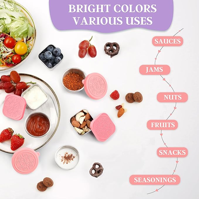 - 【EASY-OPEN COLORFUL LID】: The soft silicone lid of the sauce cups is not only cute, but also very easy to put on and take off. The colorful silicone lid set not only accommodates a variety of preferences, but can also be used to easily differentiate between different sauces in the container, making your meal prep and kitchen storage more convenient