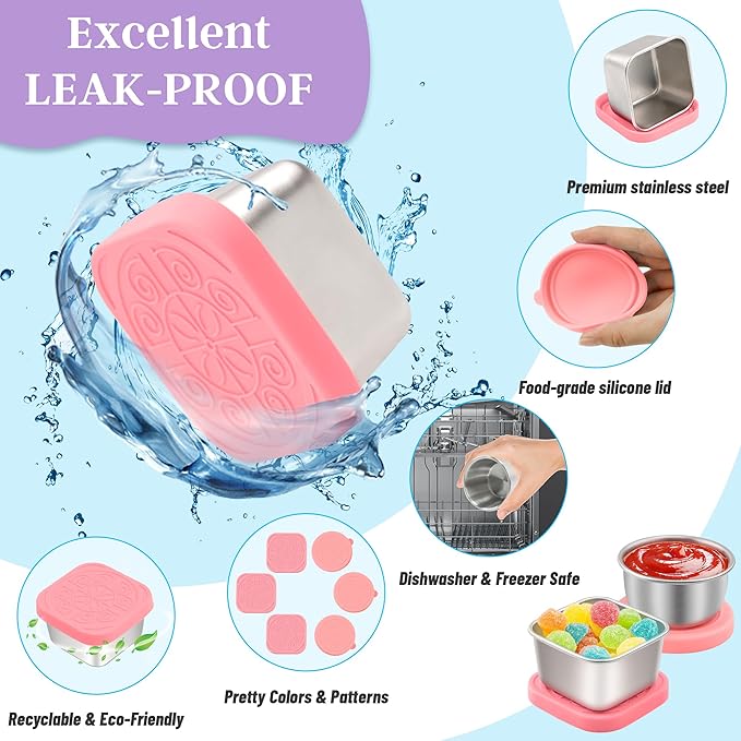 - 【SAFE AND RELIABLE MATERIAL】: The small container with lid is made of quality 304 stainless steel and food-grade safe silicone, which makes our sauce cup non-toxic, dishwasher safe, freezer safe and durable enough for long-termism lifestyle. Our salad container for lunch can completely replace disposable containers, reduce the use of plastic and achieve environmental protection