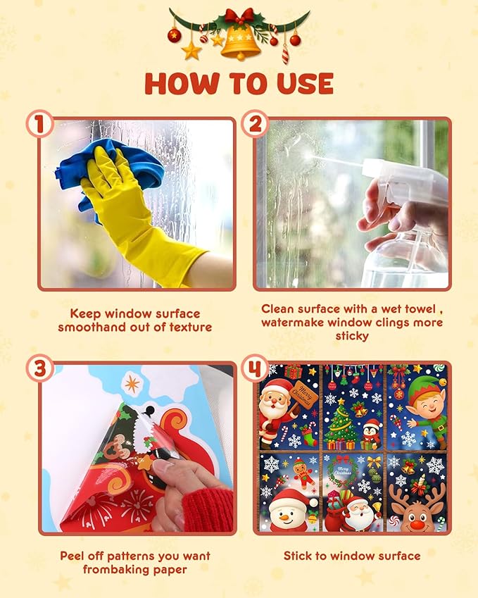 - Easy to Use: No adhesives or glue required! Simply clean the surface, spray a little water, peel off the decal, and stick it on smooth surfaces like windows, mirrors, or glass doors. The decals adhere firmly and can be easily removed without leaving any residue. Plus, they're reusable, so you can enjoy them year after year