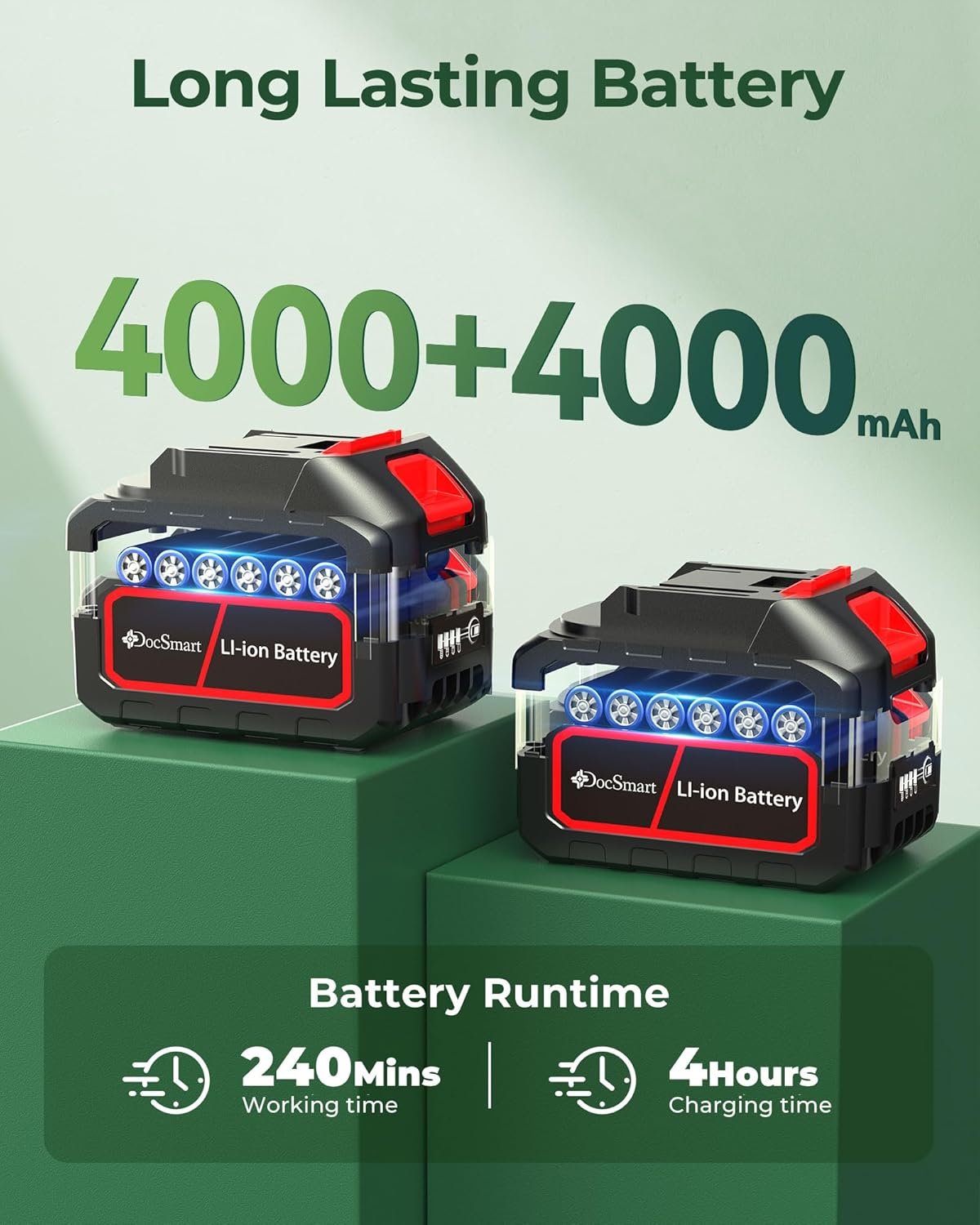 - Cordless & Portable: The handheld hedge trimmer takes about 4 hours to full charge and can work for 240 minutes. It comes with 2 pcs 4000mAh rechargeable batteries. 1 Green light on the battery represents 25% power. Say goodbye to struggling with electrical cords and make your garden art easier. Our hedge clipper is compatible with Makita batteries, but our device batteries aren't compatible with Makita devices