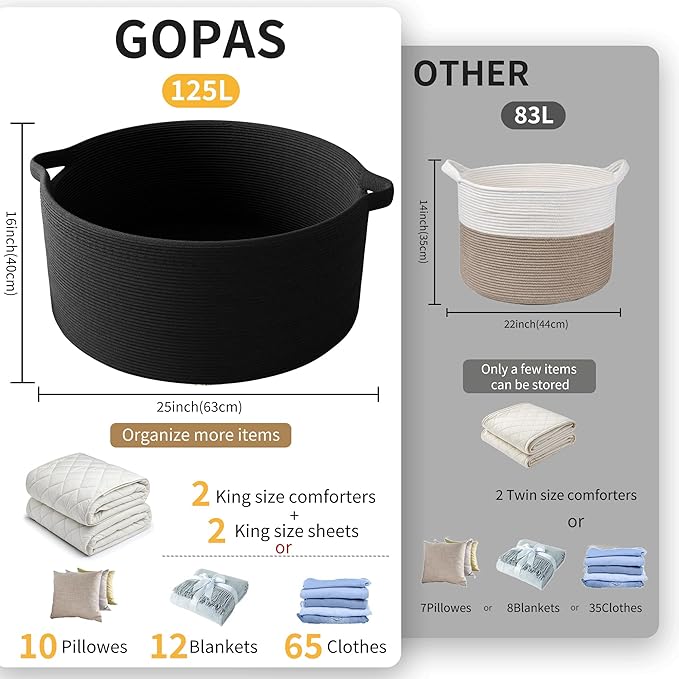 125L Extra Large Blanket Basket, 25" x 16", Jumbo Laundry Woven Baskets Decorative Home, Cotton Rope Basket with Handles, Baby Toy Baskets for Storage, Black