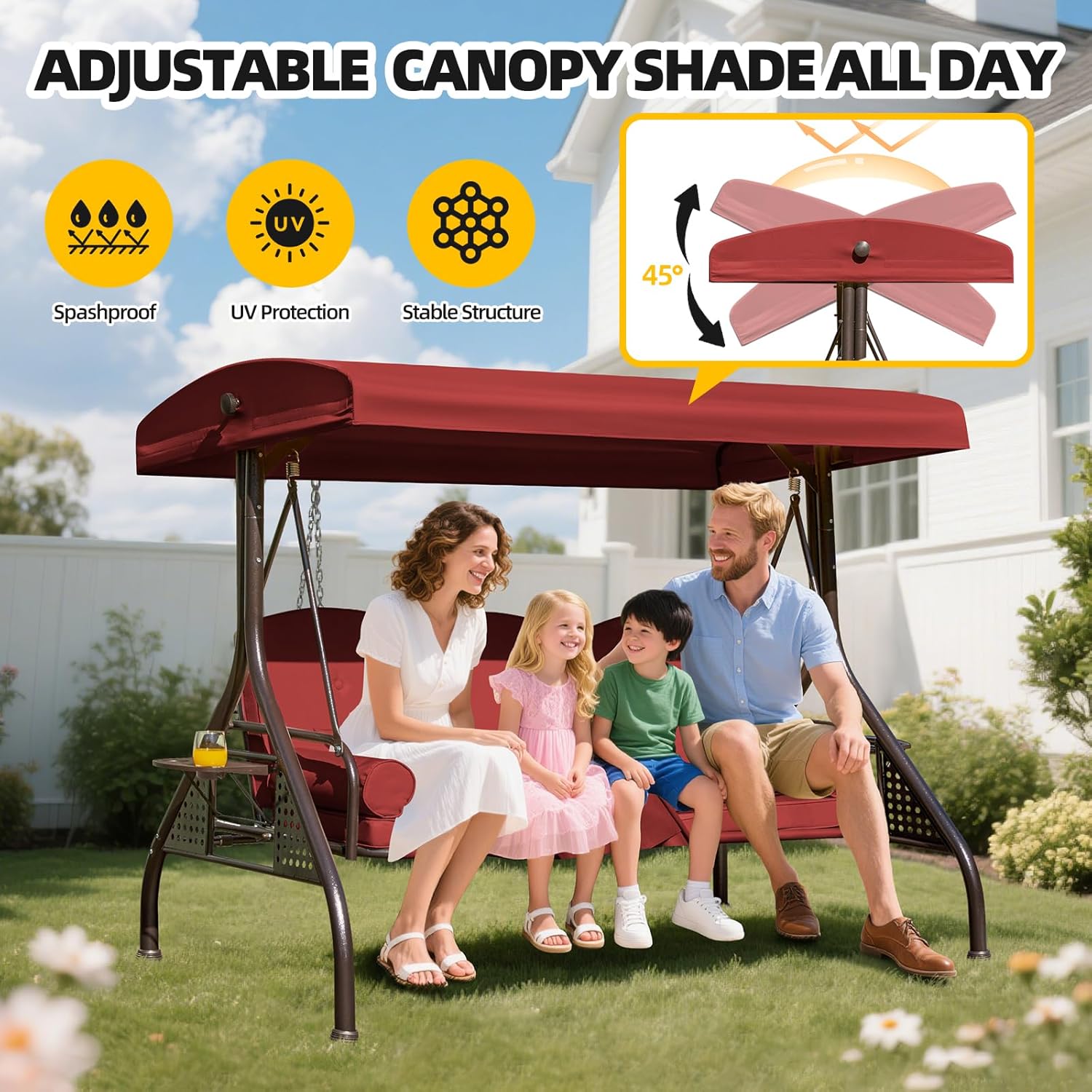- Upgraded 135° Adjustable Hardtop Canopy: Enjoy perfect shade anytime with our upgraded patio swing with canopy! The 3-seat porch swing with canopy features a hardtop adjustable up to 135°, so you can read, nap, or relax without worrying about harsh sun or unexpected rain. Effortlessly set the suitable angle by turning the sturdy side knob, making this outdoor swing ideal for every moment outdoors