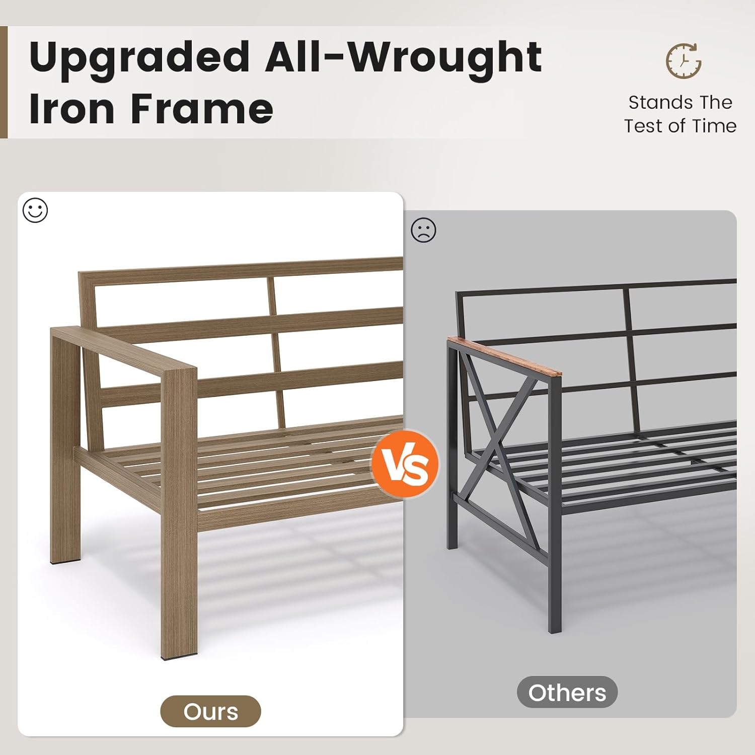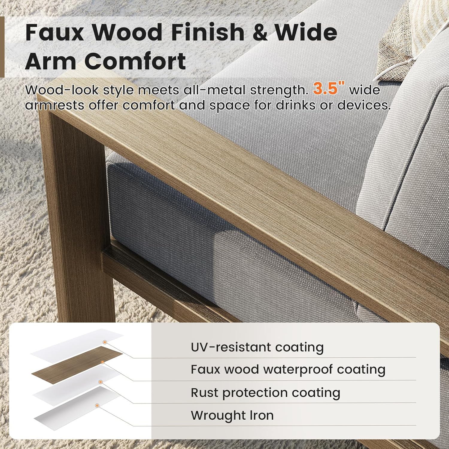 - Tough Frame with Faux Wood Finish: This outdoor patio furniture set features a stylish faux wood grain finish on powder-coated wrought iron, combining the look of wood with the strength of metal. This finish protects against rust, scratches, and weathering—extending the outdoor sectional furniture lifespan with minimal upkeep.