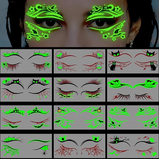 Glow in Dark Halloween Eyeliner Temporary Tattoos for Adults, 12 Pairs Luminous Eyes Fake Tattoos, Gothic Spooky Designs with Spiders Web, Bats, Cats, Skulls, Black