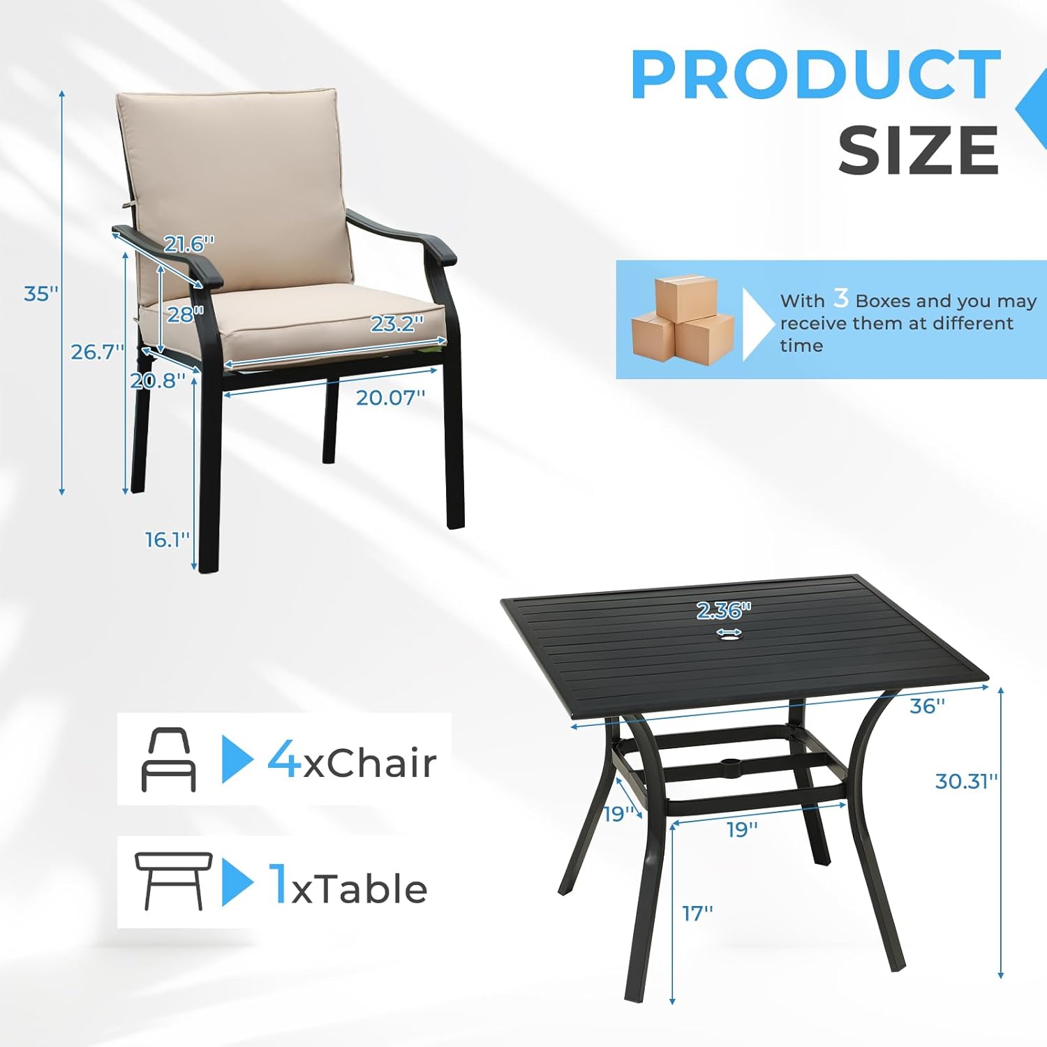 - 5-Piece Patio Dining Set: Our patio furniture set includes 4 chairs and 1 square outdoor dining table. This outdoor dining set is finished in a black powder coated surface and features soft vertical curves that match the modern clean aesthetic. The khaki cushions add a splash of colour to the set for understated sophistication.