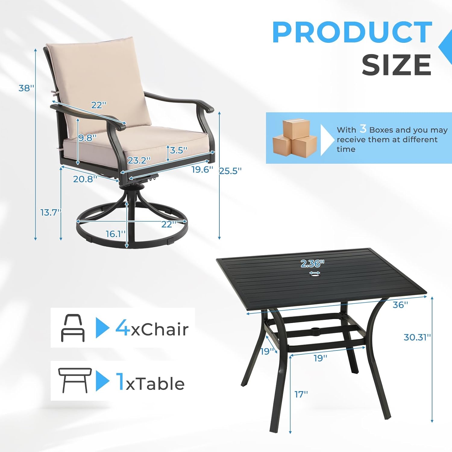 5-Piece Outdoor Patio Dining Set, Outdoor Patio Swivel Chair & Square Metal Patio Table, Outdoor Furniture Dining Set for Patio, Balcony, Lawn, Garden, Backyard (1 Square Table+ 4 Swivel Chairs)