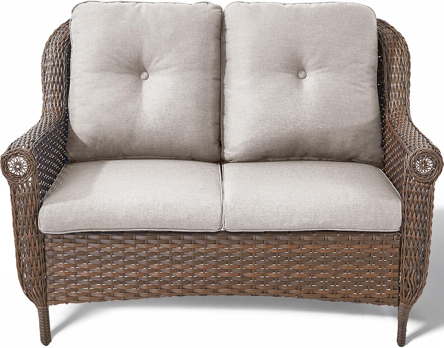 Patio Loveseat Outdoor Wicker Sofa - Heavy Duty All-Weather Brown Rattan 2-Person Sofas with High Back and Comfortable Thick Cushions for Garden Back Porch Poolside Apartment - Beige