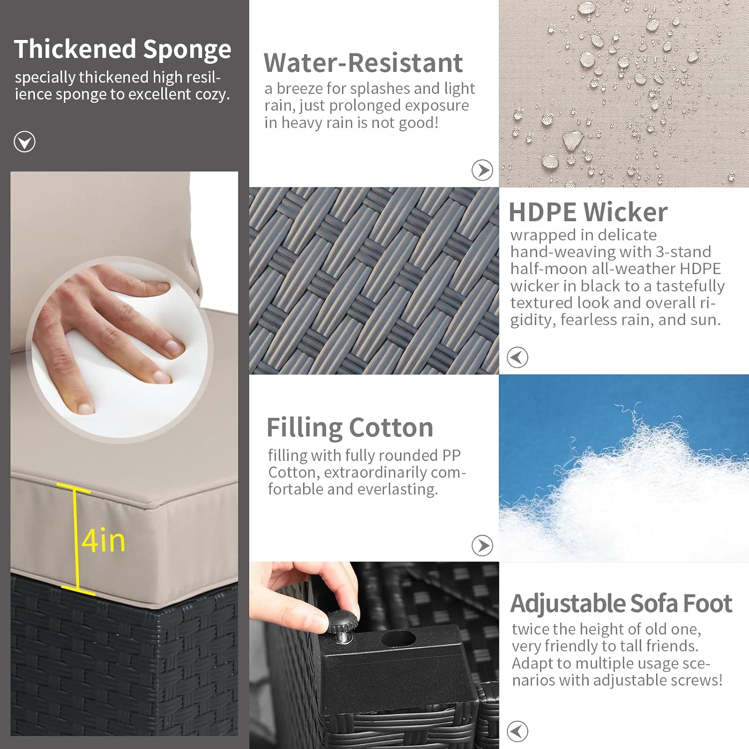 - Quality and Maintain: Delicate composite weaving with half-moon and round all-weather HDPE wicker material handwoven over fully-welded powder-coated steel framing makes outdoor patio furniture very durable and sturdy. Breathable 250G polyester Anti-UV and water-repellent fabric. Each piece is designed to withstand sunshine beating down and rainstorms rolling through.