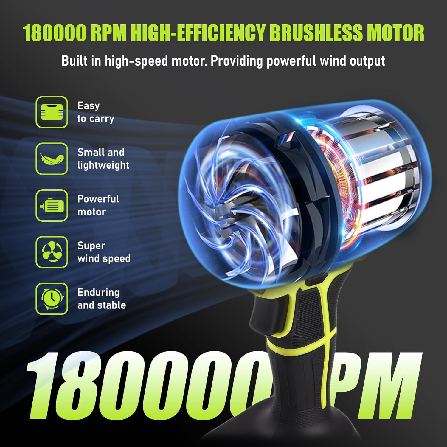 - High-Performance Turbo Motor: Electric Cordless Leaf Blower Experience unmatched power with our 180000 RPM electric cordless leaf blower, delivering a high-speed airflow wind speed. Perfect for clearing leaves, dust, and debris with ease.