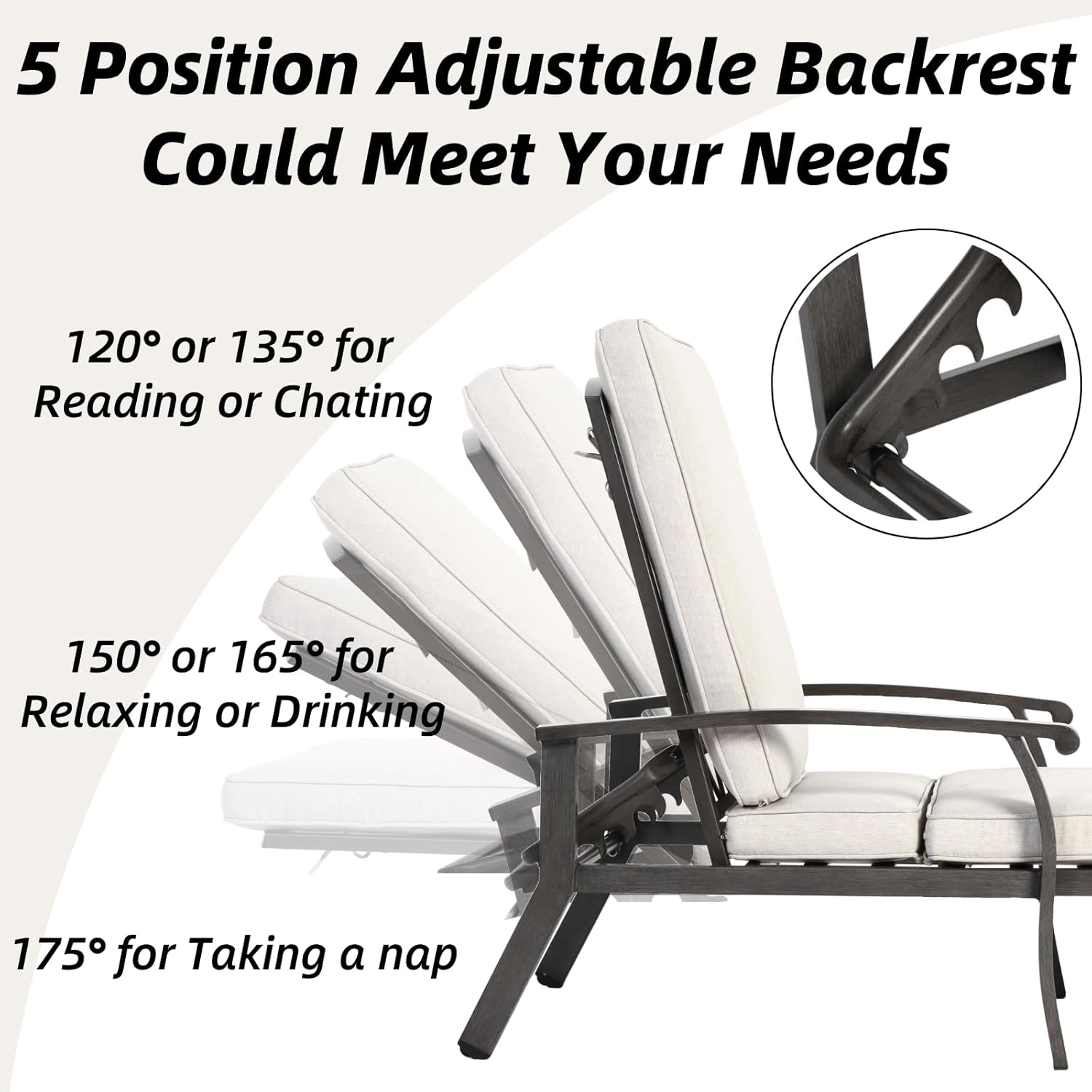- - 5-Position Adjustable Backrest: The ergonomically designed adjustable backrest can be adjusted to suit your needs, providing you with the perfect lumbar support for the ultimate relaxation experience after sunbathing or exercising outdoors