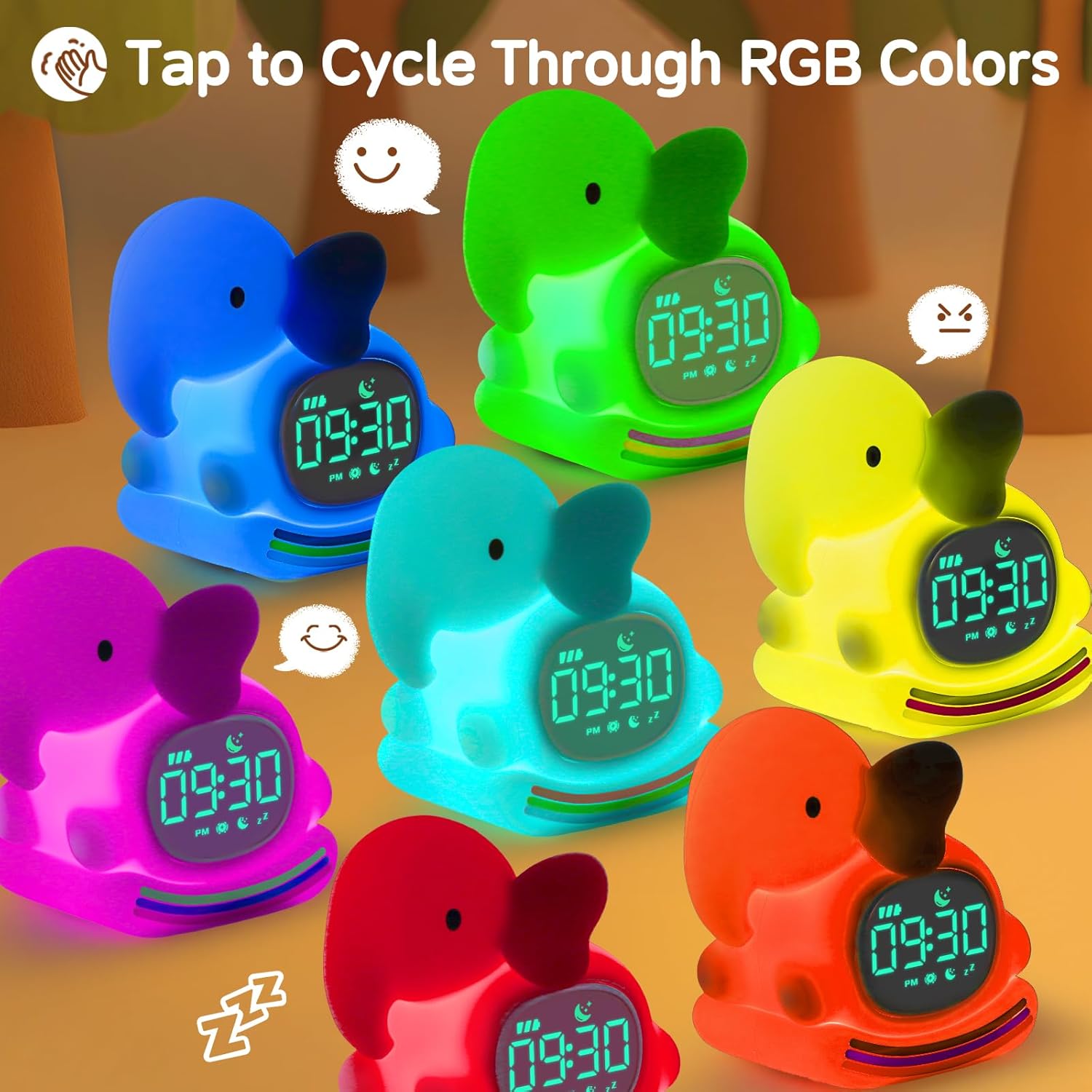 Alarm Clock for Kids with Night Light, Sleep Training Clock Time to Wake Clock, Rechargeable Silicone Light for Bedroom, Perfect Sleep Companion for Boys Girls, Green Elephant