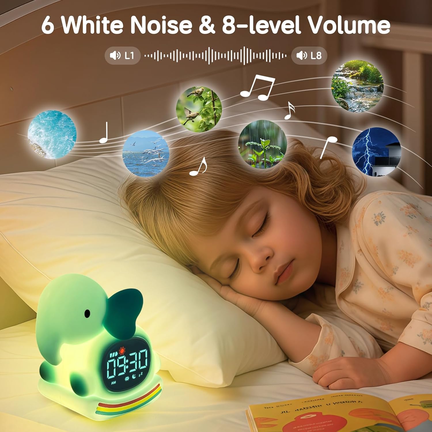 - 6 Soothing White Noise: Includes rain, ocean, and other calming sounds to block out background noise. With 8 volume levels, it helps children fall asleep faster and sleep more soundly.