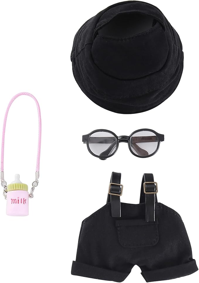 4-Piece 17cm Doll Clothes Set Clothes for Dolls Black Overalls, Fisherman Hat, Glasses & Pendant – 17cm Doll Overalls Accessories Only
