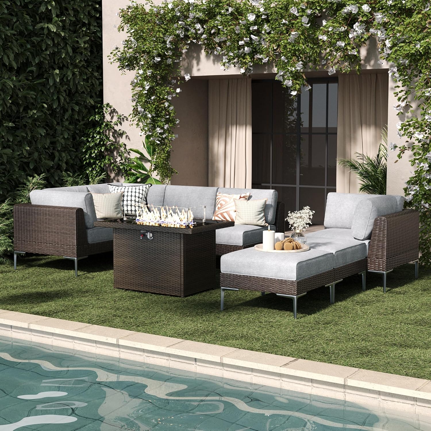 LayinSun 8-Piece Outdoor Modular Wicker Sectional Sofa with Fire Pit Table, Patio Furniture Conversation Set with Deep Seating and Thick Cushions