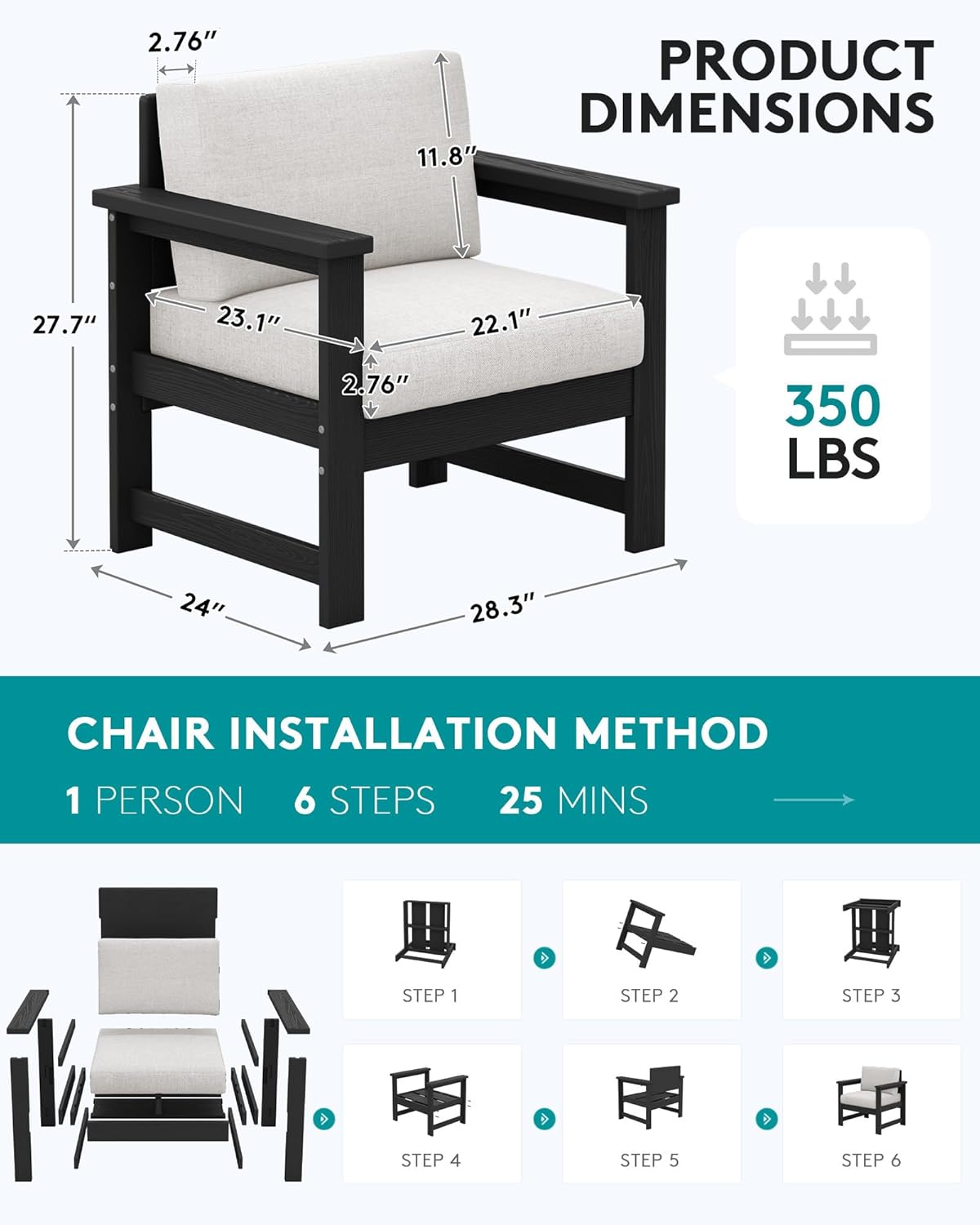 SERWALL 2 Pieces Single Cushioned Sofa Armchair, Black HDPE Adirondack Outdoor Sofa Lounge with Khaki Cushion