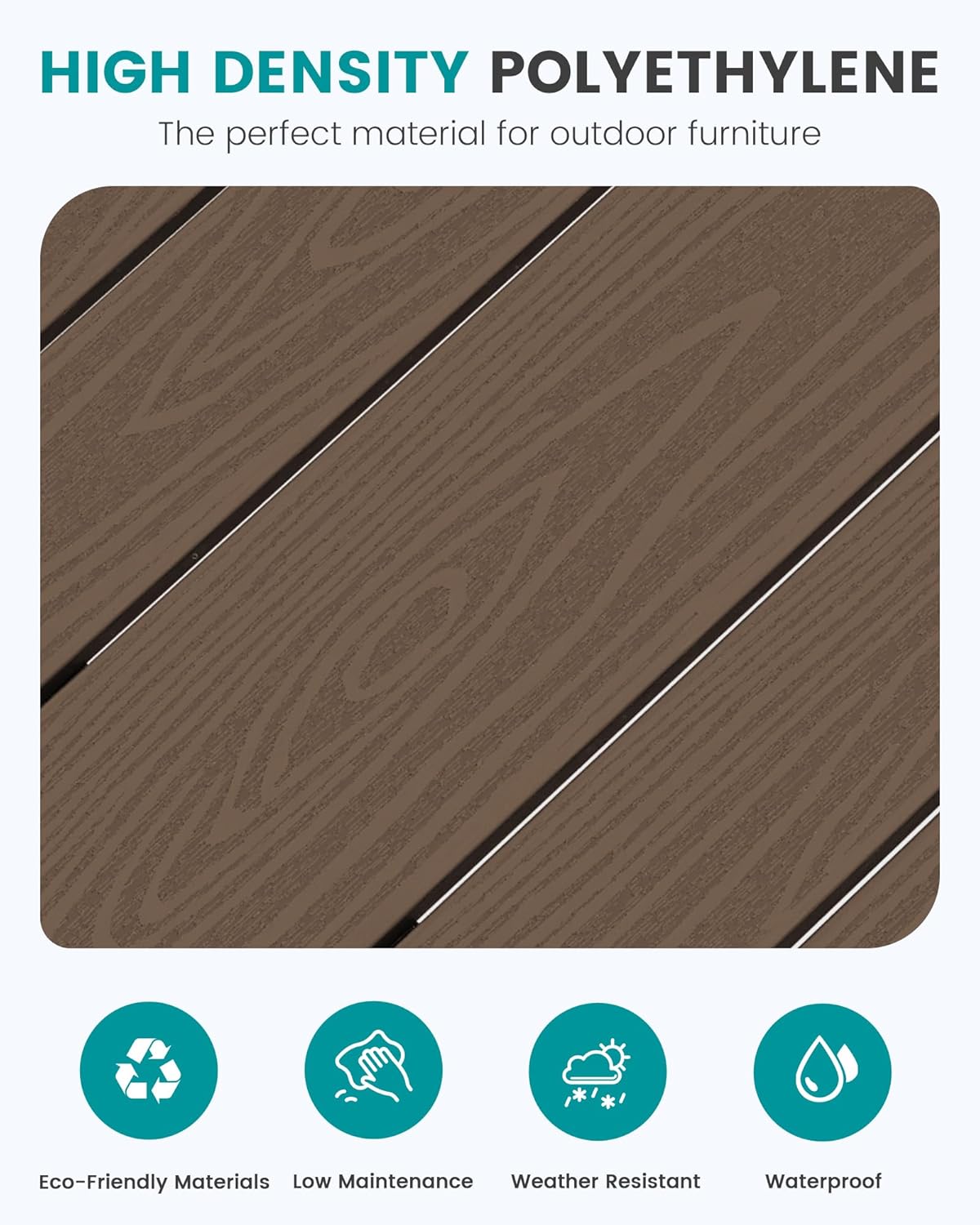 - Sturdy and Durable: Serwall outdoor furniture crafted from recyclable HDPE (High-Density Polyethylene), this material is built to withstand extreme weather conditions, including intense sun, freezing temperatures, strong winds, and heavy rain, all while maintaining its original color.