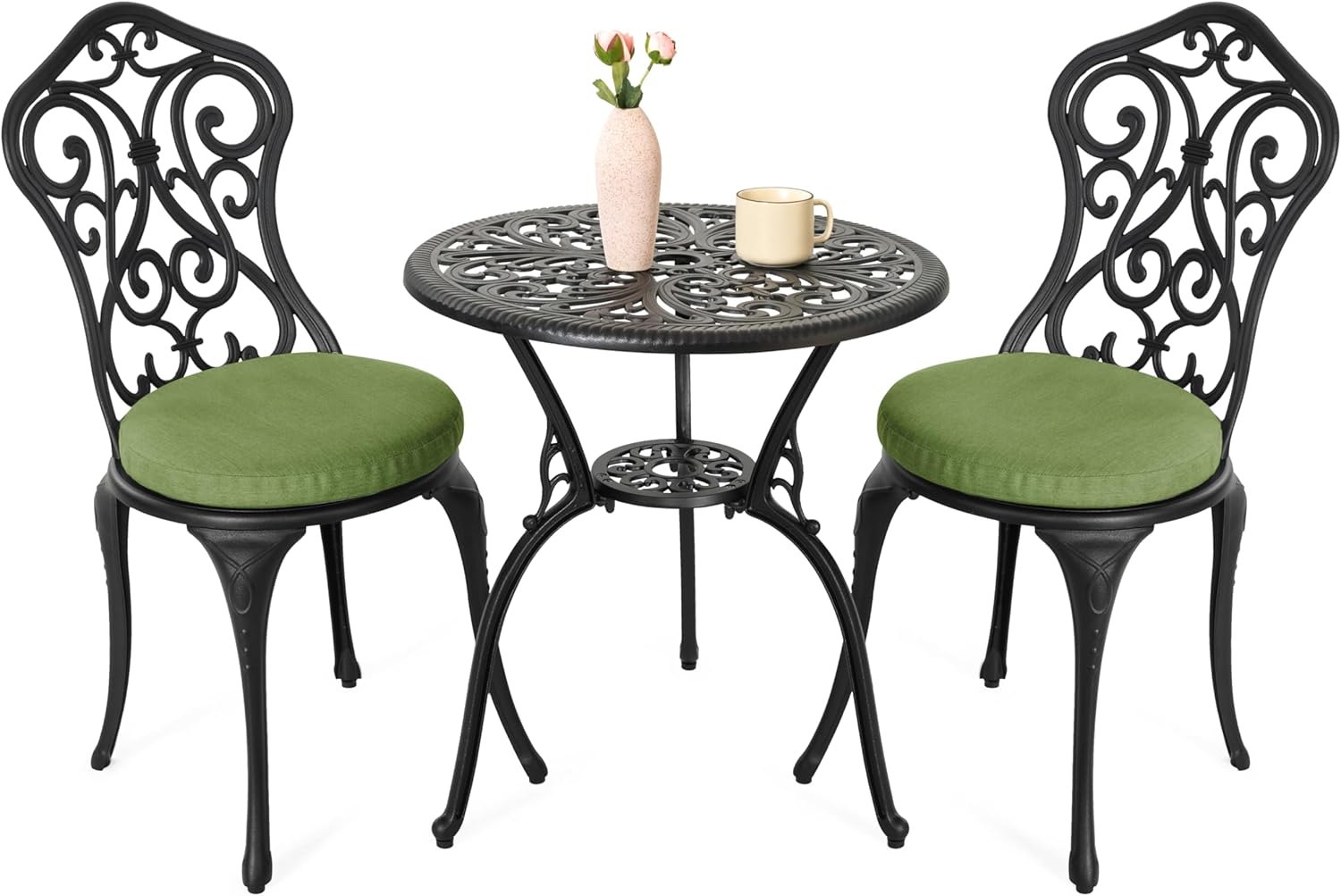 - Cast Aluminum: This outdoor bistro set is made from cast aluminum, ensuring excellent durability and rust resistance. Its sturdy yet lightweight construction allows for easy transport and long-lasting use in any weather