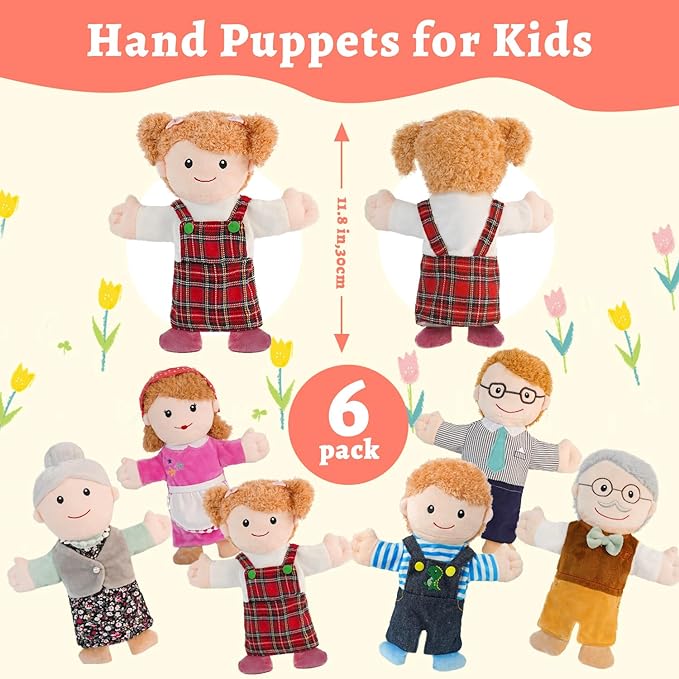 - Hand Puppets Set for Child, including 6 family members: 11.8 inches father, mother, grandpa, grandma, son and daughter. These full body hand puppets have multiple uses, ideal for family role play, storytelling, and interactive games with kids.