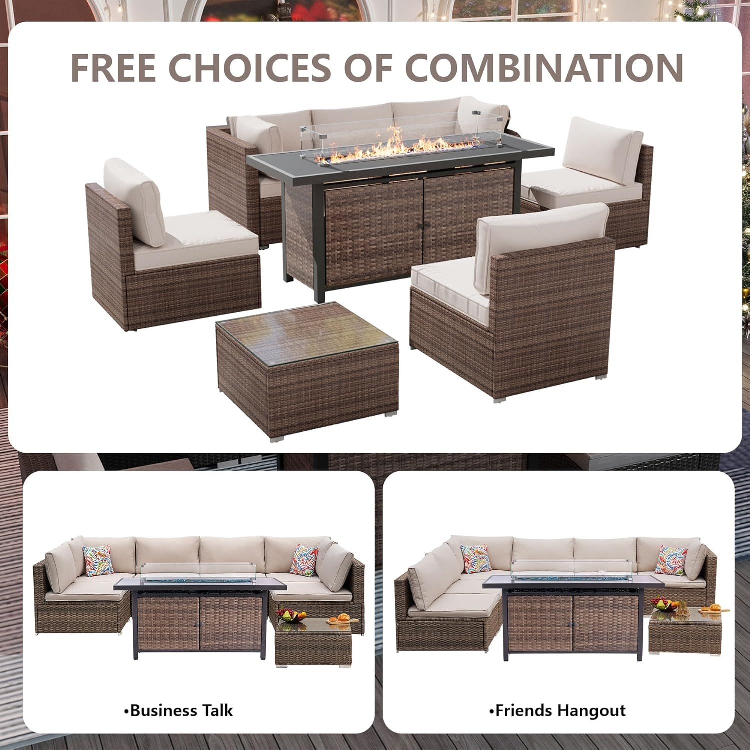 - 【Complete 25-Piece Set】 Includes 8 main furniture (1 Fire Pit Table + 1 Coffee Table + 2 Arm Chairs + 4 Armless Chairs) & 17 premium accessories (6 Seat Cushions + 8 Back Cushions + 2 Pillows + 1 Glass Windshield). Everything needed for instant outdoor living