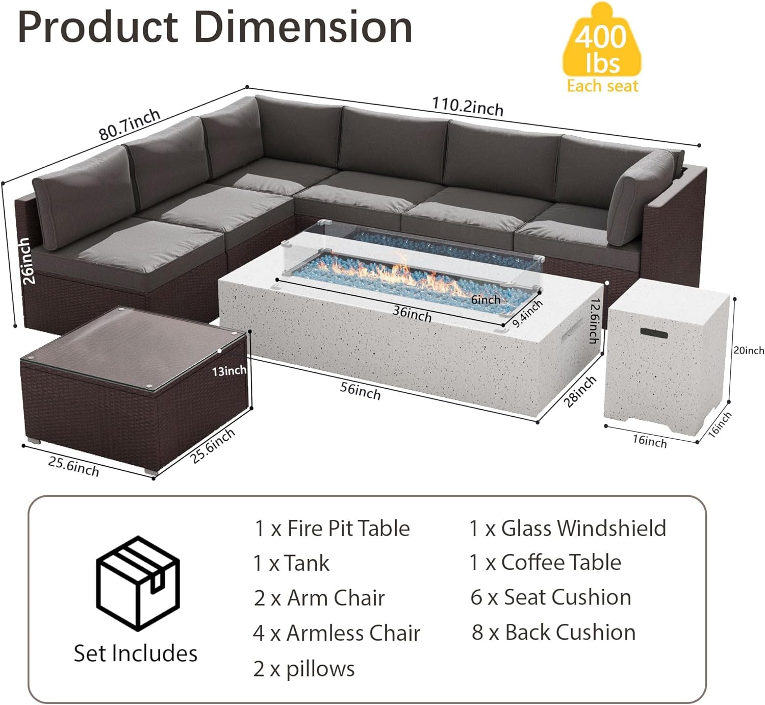 - 【Complete 26-Piece Set】 Includes 8 main furniture (1 Fire Pit Table + 1 Coffee Table + 2 Arm Chairs + 4 Armless Chairs + 1 Tank) & 18 premium accessories (6 Seat Cushions + 8 Back Cushions + 2 Pillows + 1 Glass Windshield). Everything needed for instant outdoor living