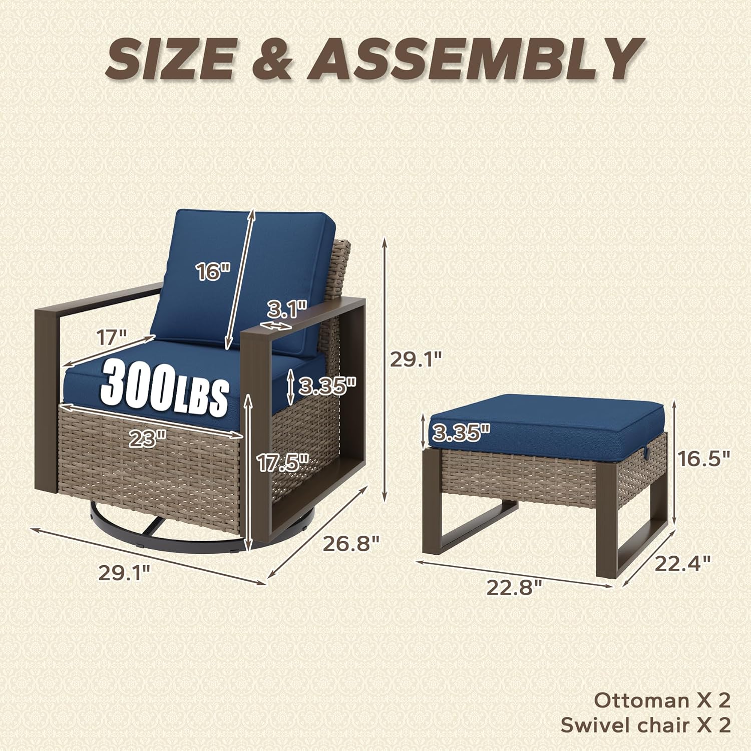 - Size : 4 PCS Swivel Chairs & Ottomans Set