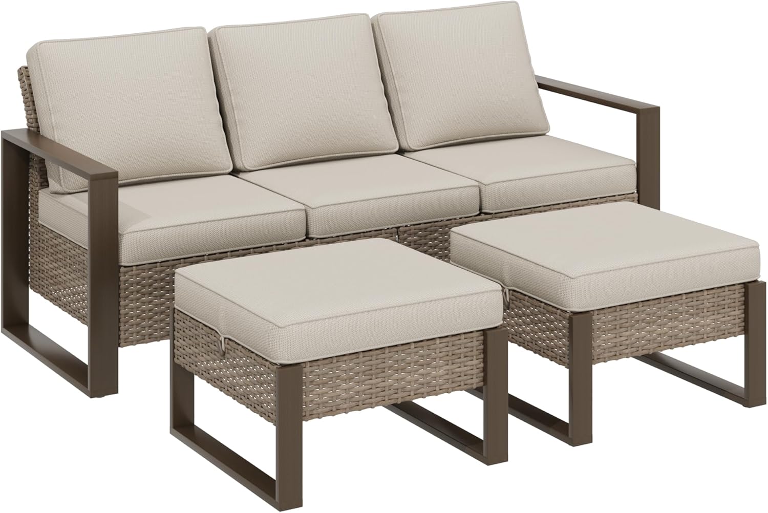 Wicker Patio 75" Sofa Set with Two Ottomans, All Weather Rattan Outdoor Conversation Furniture Set with Wood-Looking Metal Armrest for Deck Backyard Porch, Beige