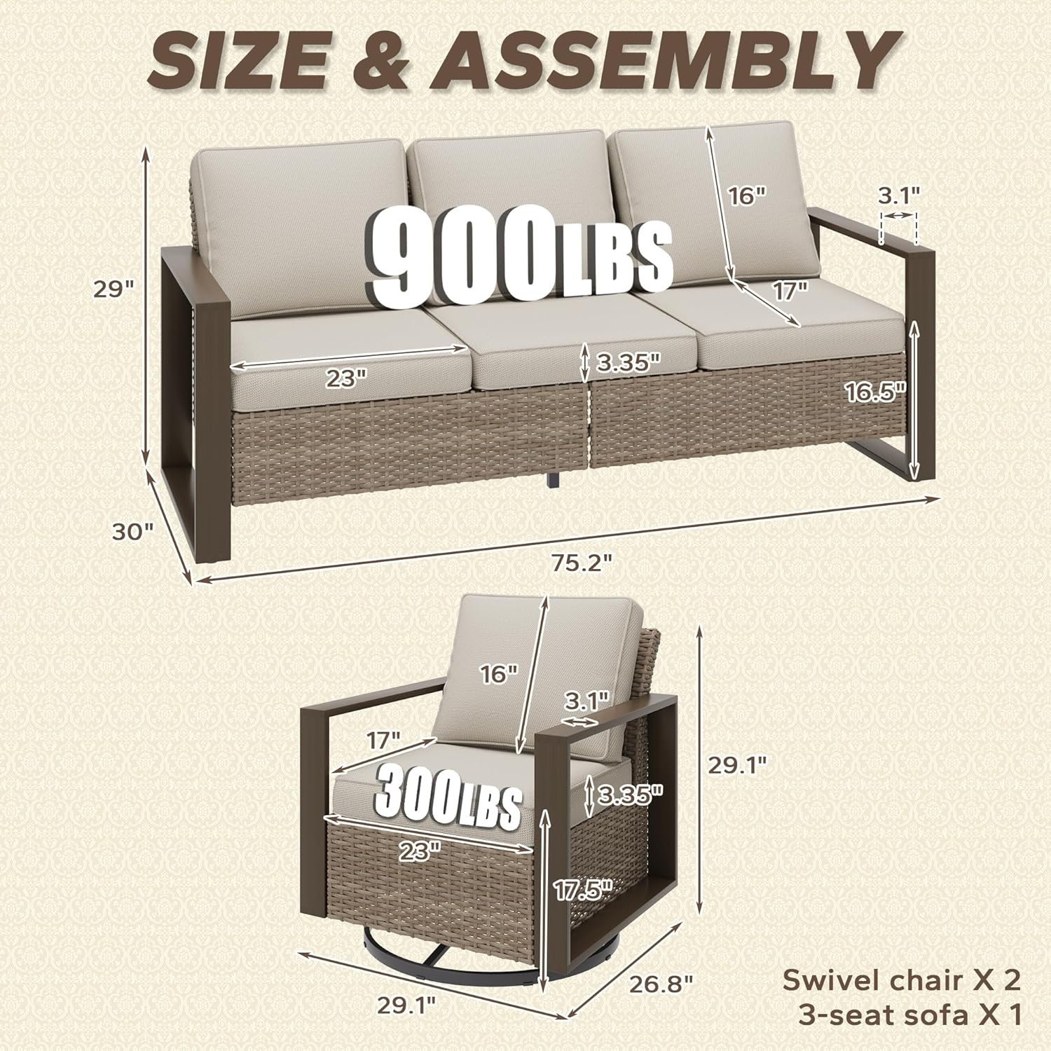 Wicker Patio 75" Sofa Set with 2 Swivel Chairs, All Weather Rattan Outdoor Conversation Furniture Set with Wood-Looking Metal Armrest & Removable Cushions for Backyard Porch, Beige