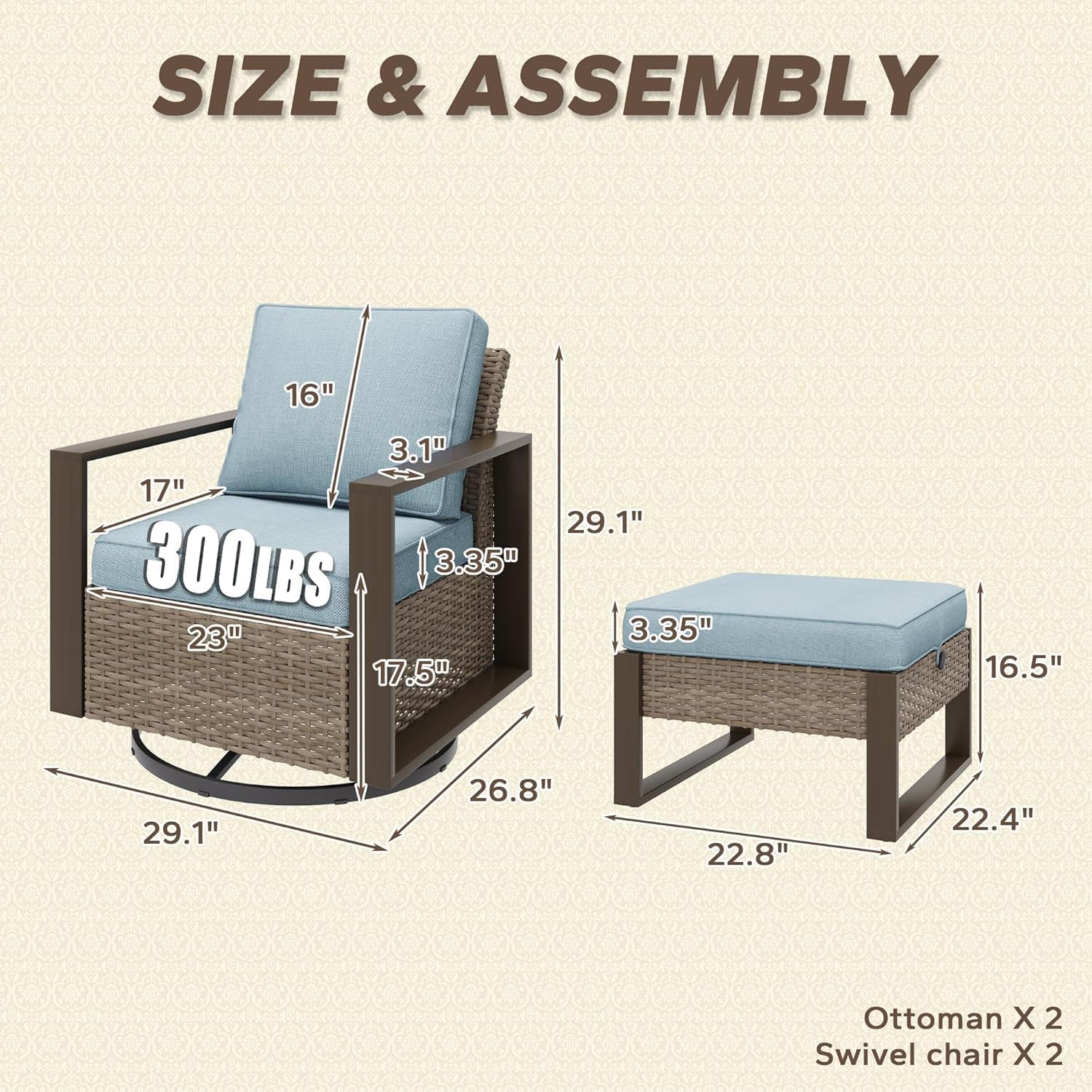 - Size : 4 PCS Swivel Chairs & Ottomans Set