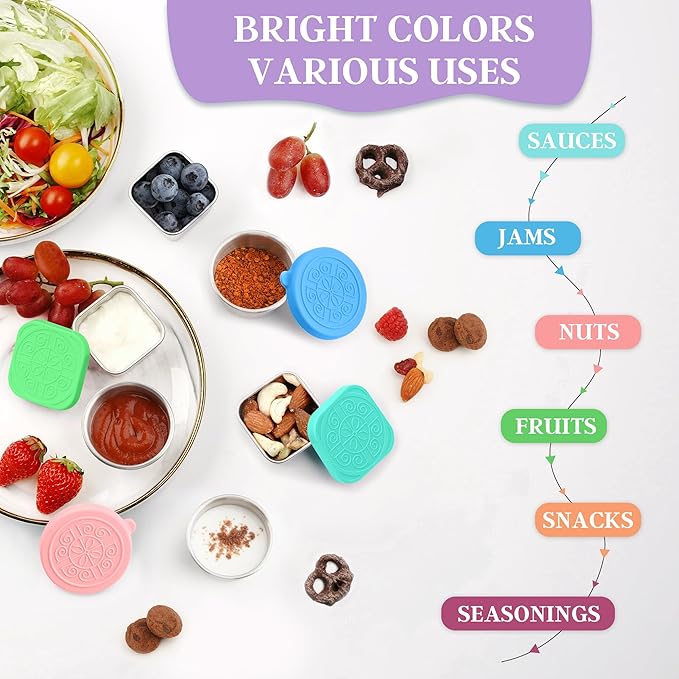 - 【EASY-OPEN COLORFUL LID】: The soft silicone lid of the sauce cups is not only cute, but also very easy to put on and take off. The colorful silicone lid set not only accommodates a variety of preferences, but can also be used to easily differentiate between different sauces in the container, making your meal prep and kitchen storage more convenient